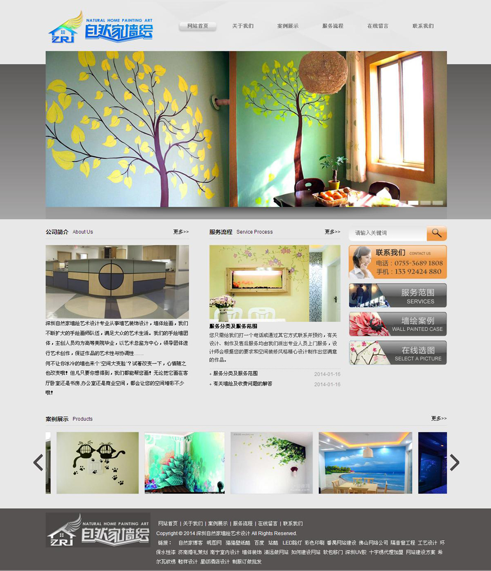 项目名称:深圳自然家墙绘艺术设计 签定时间:2013-11-28 项目网址:http://www.zrj88.com/ 项目简介: 集设计、绘画于一身的墙绘工作室 有着专业的人员: 成员均毕业于美术艺术学院 专业的设计