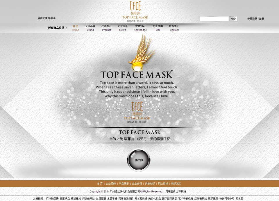 项目名称:广州语丝润化妆品有限公司 签定时间:2013-12-10 项目网址:http://www.tfce.cn 项目简介: 广州语丝润化妆品有限公司是一家专注于顶级美容护肤产品的公司,旗下拥有高端面膜品牌塔菲诗。语丝