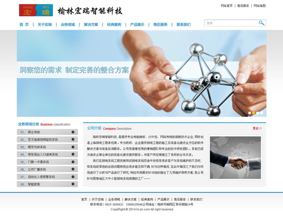 项目名称:榆林宏瑞智能科技有限公司 签定时间:2014-2-18 项目网址:http://www.hr-zn.com 项目简介: 榆林宏瑞智能科技有限公司成立于2006年5月,位于常乐南路24号,注册于榆林市工商行政管理局,注册