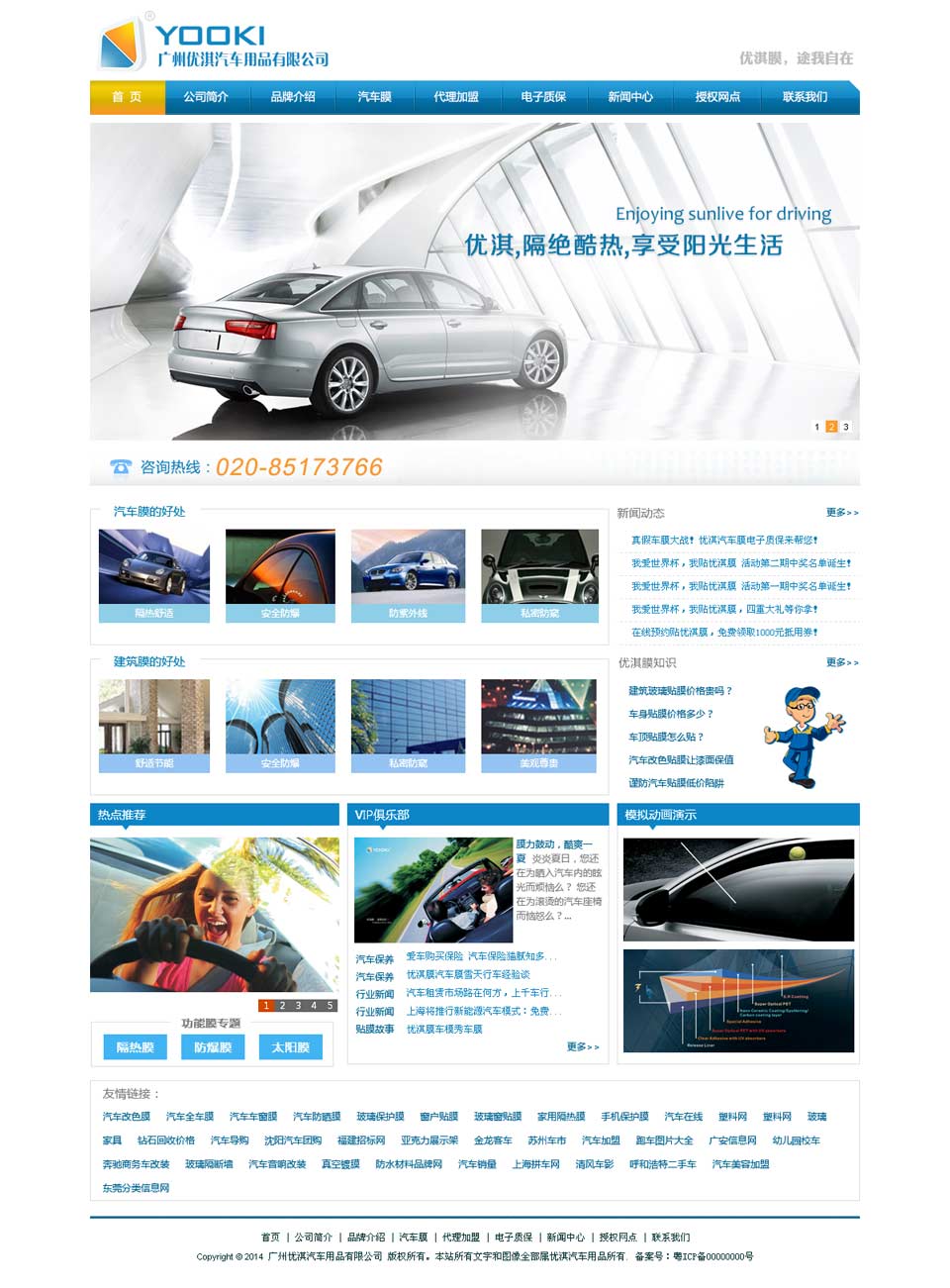 项目名称:广州市优淇汽车用品有限公司 签定时间:2014-3-1 项目网址:http://www.yooki.com.cn 项目简介: 广州市优淇汽车用品有限公司原材料由美国专业防爆膜公司生产制造,荣获美国能源部门颁奖表扬,