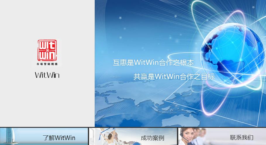 项目名称:广州慧盈广告有限公司 签订时间:2016-8-26 项目网址:www.witwinchina.cn 公司简介: 以品牌、商户资源整合为基础,为客户提供一体化、综合性市场营销服务解决方案。 WitWin在金融、通
