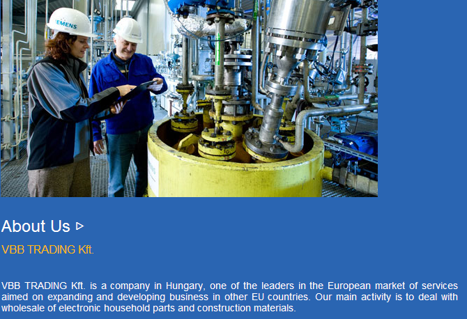 VBB TRADING Kft. is a company in Hungary, one of the leaders in the European market of services aimed on expanding and developing business in other EU countries. Our main activity is to deal with wholesale of electronic household parts and construction materials.