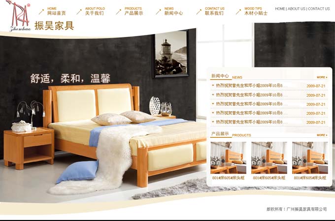项目名称:广州振昊家具有限公司网站制作签定日期:2009年9月16日网站首页效果:位于广州市番禺区大岗镇北流工业区,占地面积50亩,首期生产车间建筑面积为一万二千六百平方,设计生产力每月二千六百套.原材料选用德国榉木,木材的订购、加工、干燥