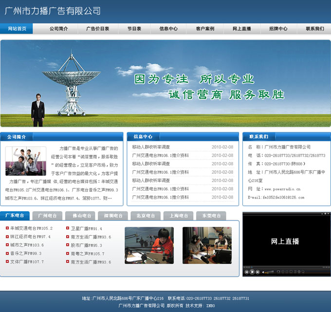项目名称:广州市力播广告有限公司网站改版签定日期:2010年2月26日网站网址:www.powerradio.cn力播广告是专业从事广播广告的经营公司,本着“诚信营商,服务取胜”的经营理念,立足客户市场,致力于客户广告效益的最大化,为客户提