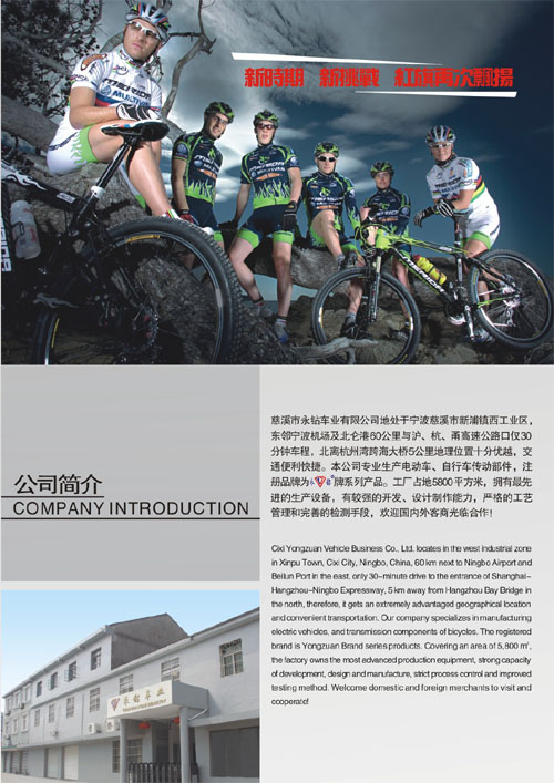 慈溪市永钻车业有限公司地处于宁波慈溪市新浦镇西工业区,东邻宁波机场北仑港60公里与泸、杭、甬高速公路口仅30分钟路程,北离杭州湾跨海大桥5公里地理位置十分优越,交通便利快捷。本公司专业生产电动车、自行车传动部件,注册品牌为永钻牌系列产品。工厂占地5800平方米,拥有最先进的生产设备,有较强的开发、设计制作能力,严格的工艺管理和完善的检测的手段。