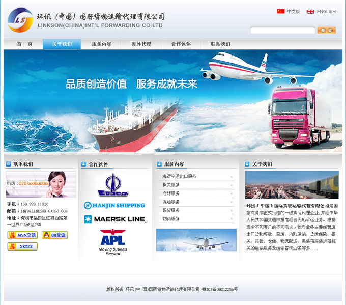 项目名称:环迅(中国)国际货物运输代理有限公司签定日期:2010年4月1日公司介绍:环迅(中国)国际货物运输代理有限公司是国家商务部正式批准的一级货运代理企业,并经中华人民共和国交通部批准经营无船承运业务。根据现今不同客户的不同需求,该公司