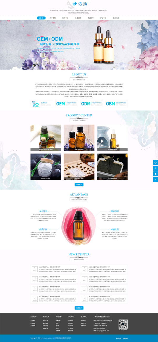 项目名称:广州佑扬化妆品有限公司建网站 项目网址:www.youyanggz.com 公司简介: 广州佑扬化妆品有限公司是广州专业的化妆品OEM/ODM企业之一。集化妆品生产、品牌方案制定、专业OEM、品牌注册备案等服务。公司占地面积