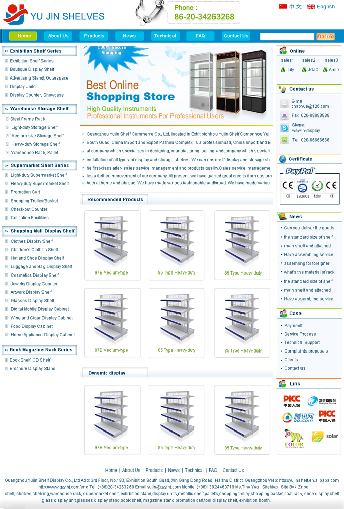 项目名称:广州宇金货架有限公司外贸营销网站建设签定日期:2010年8月20日广州市宇金货架有限公司位于广州国际会展中心琶洲会展南四路、人杰地灵交通便利,是一家专注致力于展柜和货架设计、研发、制造、销售及售后长期综合服务的终端生产商。公司拥有
