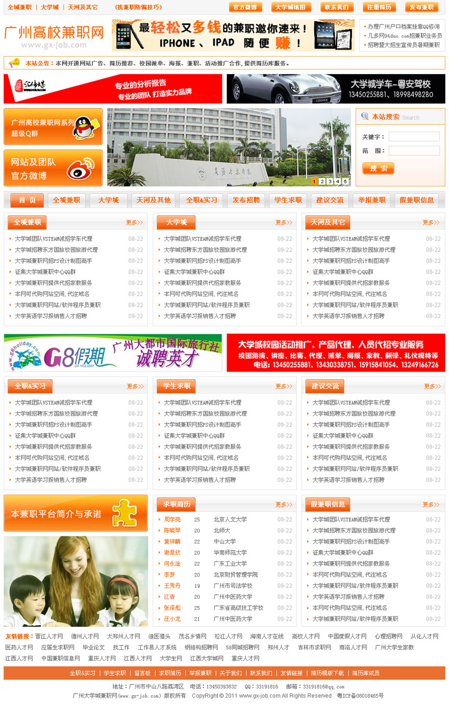 项目名称:广州高校兼职网网站建设签定日期:2011年8月17日网址:http://www.gx-job.com/网站首页效果图:(缩略图)