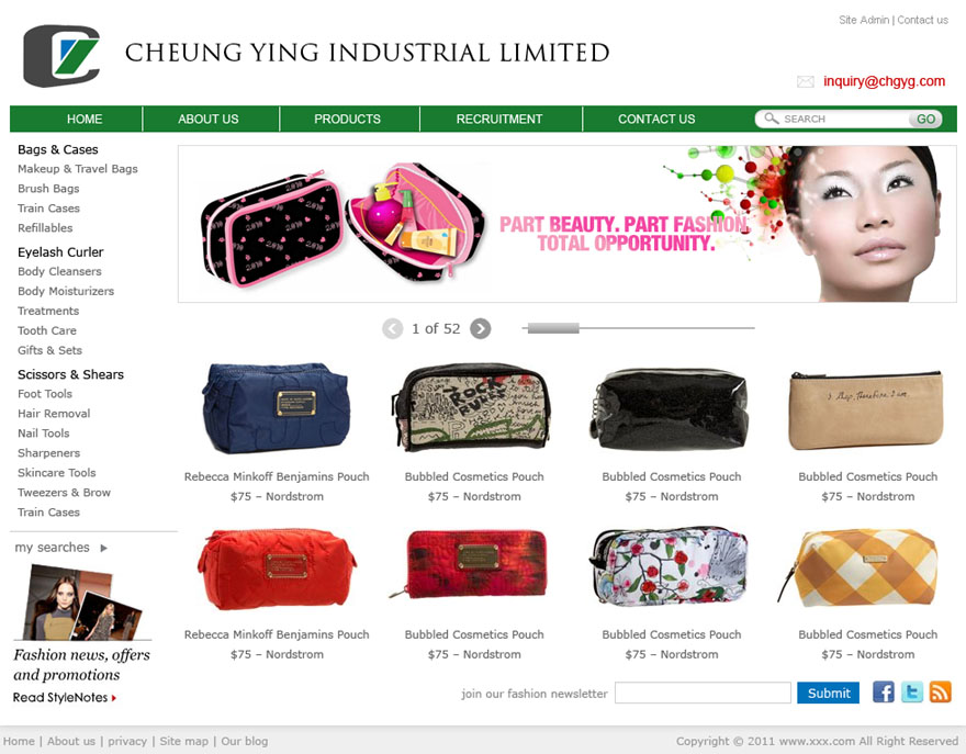 长盈兆业有限公司于1990年创立,从业20年来一如既往秉承“专业质量、精诚至上”的经营理念,产品囊括化妆袋、晚妆袋、时尚袋、沙滩袋、首饰盒、休闲袋、PVC透明包装袋、旅行运动袋及男装袋,工艺精良、花色入时、规格齐全。