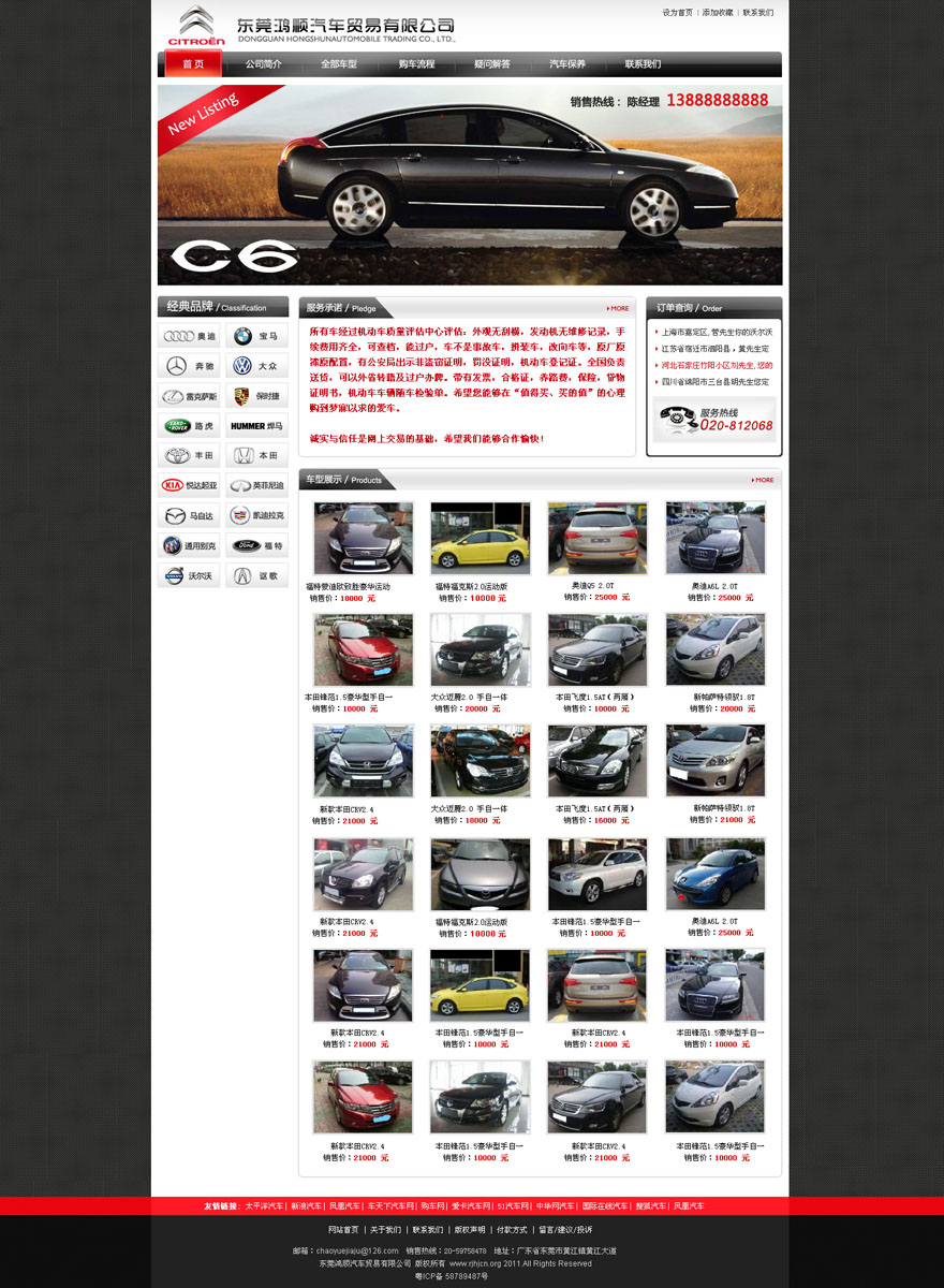 项目名称:东莞鸿顺汽车贸易有限公司网站建设签定日期:2011年9月21日网站首页效果图(缩略图):公司简介:本公司建立于2000年,已有十多年的售车经验,是一个集二手车收购、销售、新旧置换、信息咨询、车售服务、经纪事务、评估保险多功能的二手