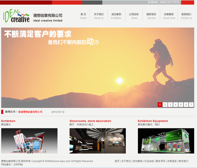 项目名称:汉森展览有限公司网站建设签定日期:2011年12月20日网址:http://www.ideal-hk.com/汉森展览有限公司是一家專業的展覽製作公司,服務範圍以大型展覽會組織、展覽展示設計及工程建造、商業會議活動與策劃、陳列室裝