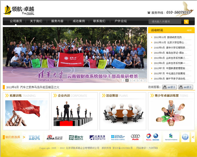 项目名称:北京领航卓越企业管理顾问有限公司网站建设签定日期:2012年2月29日网址:http://www.topsailor.com.cn北京领航卓越企业管理顾问有限公司成立于2006年,位于北京。在中国体验式培训快速发展的市场机遇下,领