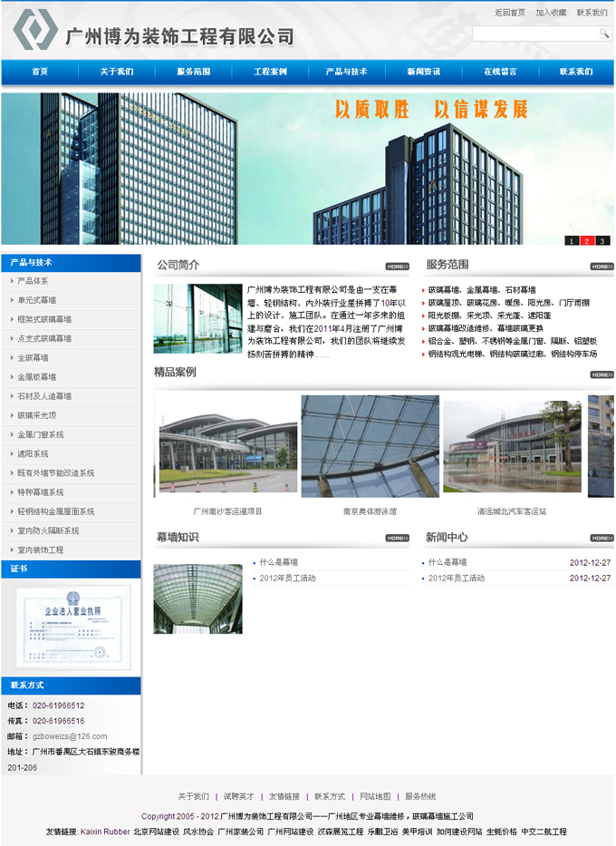 项目名称:广州博为装饰工程有限公司网站建设签定日期:2012年7月13日网址:http://www.boweizs.com广州博为装饰工程有限公司是由一支在幕墙、轻钢结构、内外装行业里拼搏了10年以上的设计、施工团队。在通过一年多来的组建与