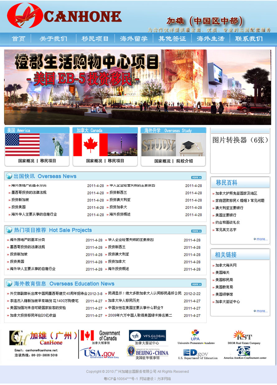项目名称:广州加雄出国服务签定日期:2012年12月5日网址:http://www.canhone.net/加雄集团成立于上世纪九十年代,至今已有超过20年的移民、留学、签证办理经验,为中国大陆范围内超过2000名各类申请人成功完成移民、留