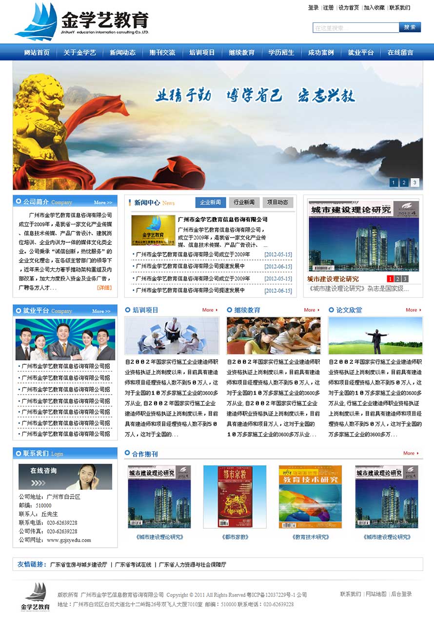 项目名称:广州市金学艺教育信息咨询有限公司网站建设签定日期:2013年2月28日网址:http://www.gzjxyedu.com/广州市金学艺教育信息咨询有限公司始成立于2009年,于2012年正式更名为金学艺教育,是我省一家集学术期刊