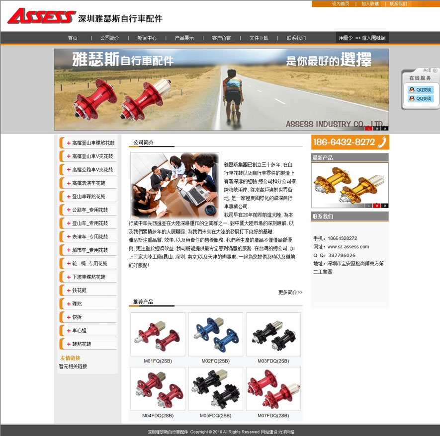 项目名称:深圳雅瑟斯自行車配件网站建设签定日期:2013年3月15日网址:http://www.sz-assess.com/index.asp雅瑟斯集團已創立三十多年,在自行車花鼓以及自行車零件的製造上有著深厚的經驗.總公司和分公司橫跨海峽