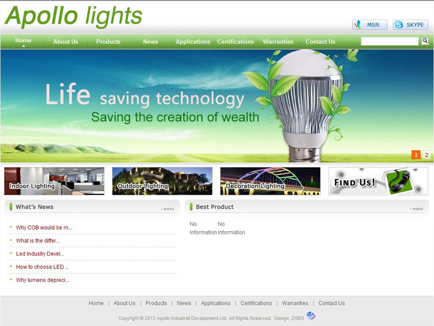 项目名称:阿波罗实业发展有限公司网站建设签定日期:2013年3月27日网址:http://www.apollo-lights.comApolloIndustrialDevelopment.,Ltdwasfoundin2009.Withmor