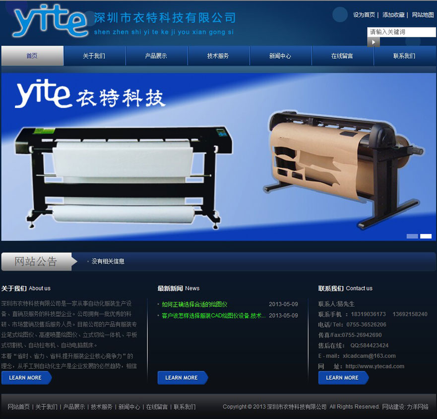 项目名称:深圳市衣特科技有限公司网站建设签定日期:2013年4月17日网址:http://www.ytecad.com深圳市衣特科技有限公司是一家从事自动化服装生产设备、直销及服务的科技型企业。公司拥有一批优秀的科研、市场营销及售后服务人员