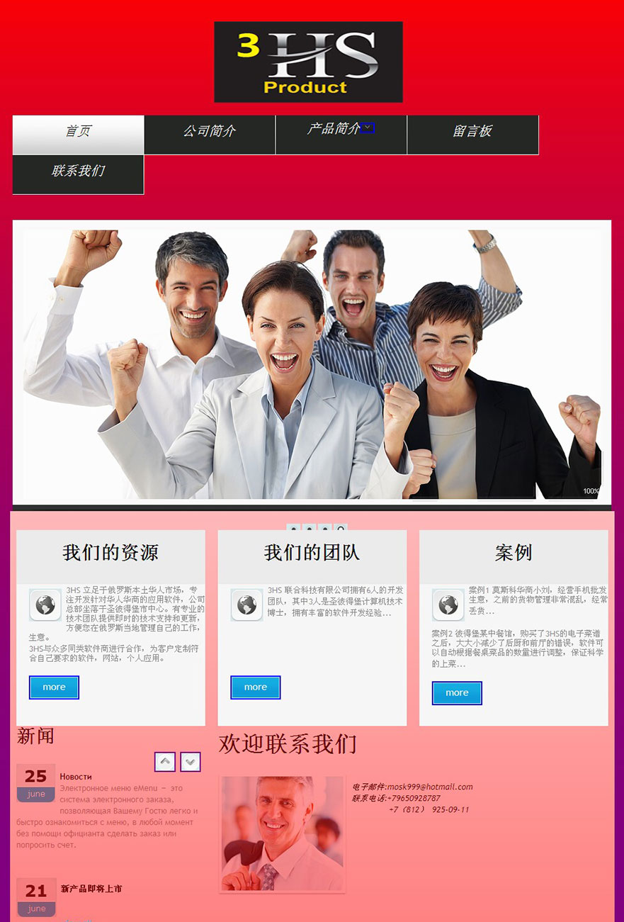 项目名称:3hs科技有限公司网站建设签定日期:2013年5月16日网址:http://www.tecmost.com3hs科技有限公司是一家由俄罗斯当地留学生博士团队组建的科技型企业。全俄华人华侨科技领导企业。3HSTECH是一家极富创新性