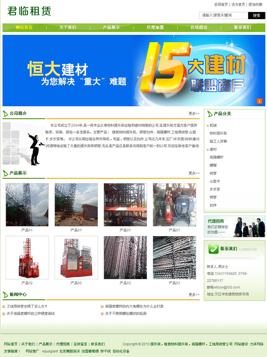 项目名称:东莞万江建材网站建设签定日期:2013年5月22日网址:http://www.junlinzl.com本公司成立于2004年,是一间专业从事物料提升架出租和建材销售的公司,在提升架方面为客户提供租赁、安装、报检一条龙服务。主要产品