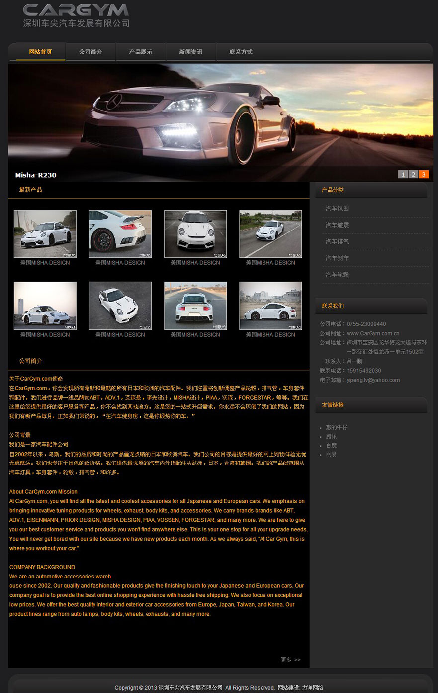 项目名称:深圳车尖汽车发展有限公司网站建设签定日期:2013年5月22日网址:http://www.cargym.com.cn在CarGym.com,你会发现所有最新和最酷的所有日本和欧洲的汽车配件。我们注重将创新调整产品轮毂,排气管,车身
