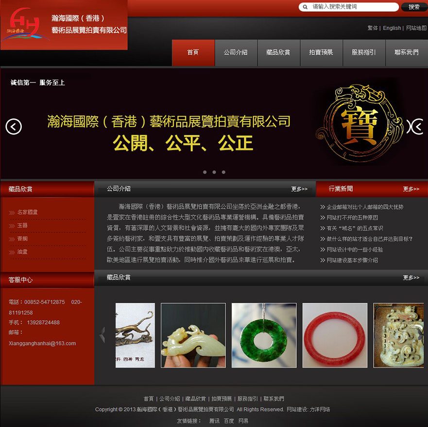 项目名称:瀚海國際(香港)藝術品展覽拍賣有限公司网站建设签定日期:2013年5月27日网址:http://www.hkhanhai.com瀚海國際(香港)藝術品展覽拍賣有限公司坐落於亞洲金融之都香港,是壹家在香港註冊的綜合性大型文化藝術品專
