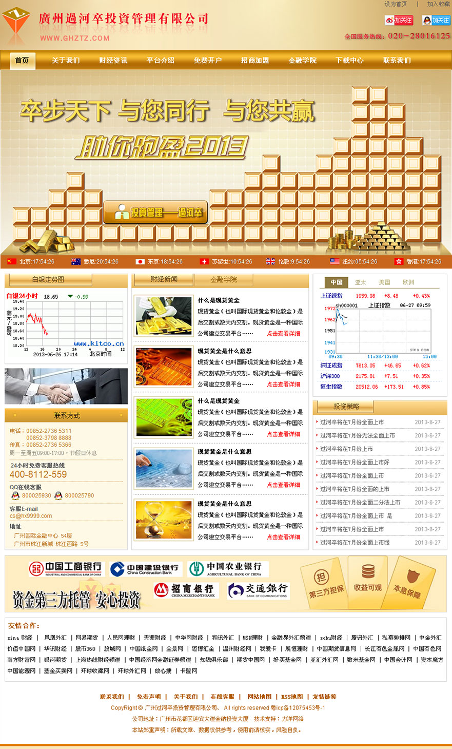 广州过河卒投资管理有限公司(以下简称“公司”)是一家金融投资管理企业。公司坐落于广州市珠江新城核心商务区的广州国际金融中心(IFC),公司拥有一流的软硬件设施、现代化的办公环境和先进的企业文化理念。公司由一群拥有丰富操盘经验的金融界人才组成,致力于大宗商品电子交易这种现代化的电子商务形式的交易分析、合作代理及策划咨询。同时,公司拥有经验丰富的股票及金融衍生品、贵金属分析师,致力于股票、贵金属的研究、咨询和分析指导。