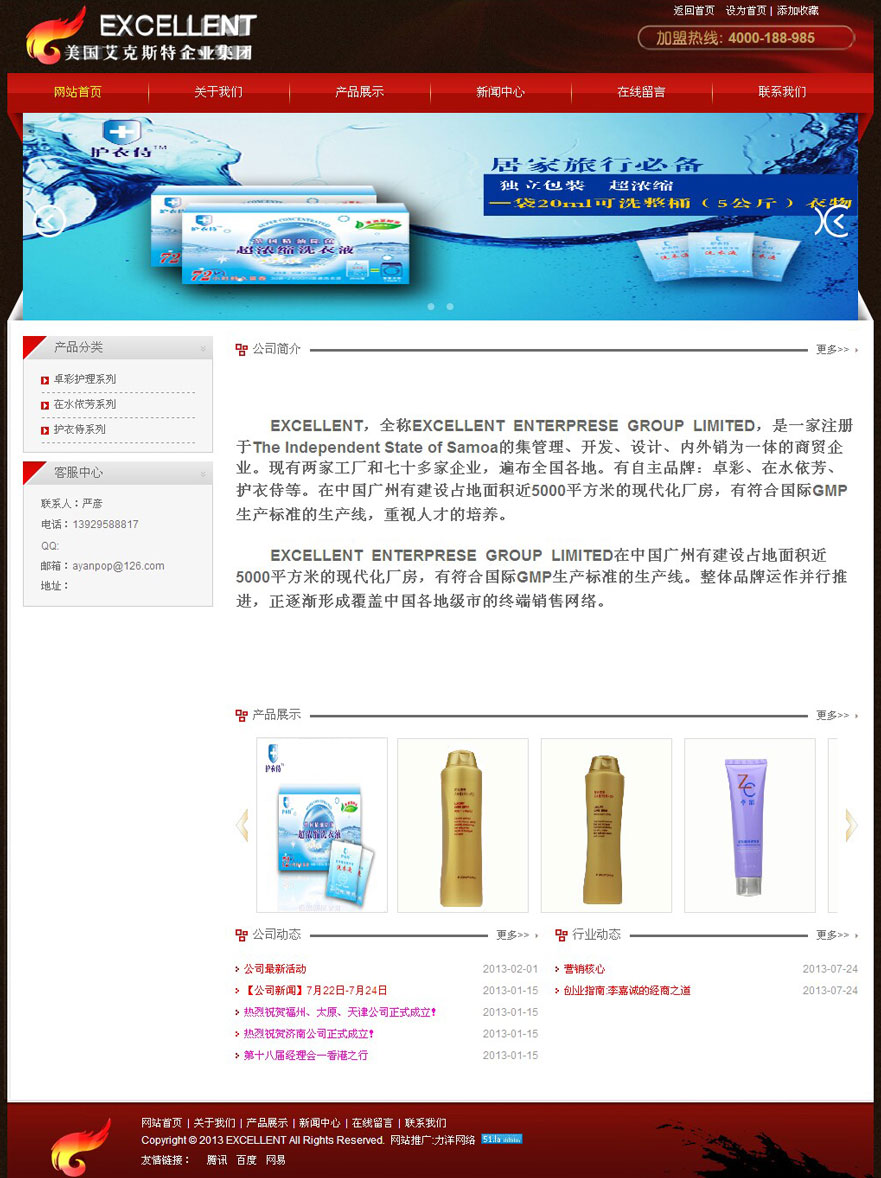 EXCELLENT,全称EXCELLENT ENTERPRESE GROUP LIMITED,是一家注册于The Independent State of Samoa的集管理、开发、设计、内外销为一体的商贸企业。现有两家工厂和七十多家企业,遍布全国各地。有自主品牌:卓彩、在水依芳、护衣侍等。在中国广州有建设占地面积近5000平方米的现代化厂房,有符合国际GMP生产标准的生产线,重视人才的培养。