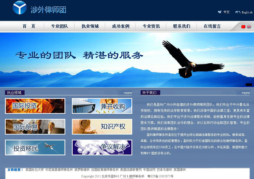 项目名称:北京市盈科(广州)律师事务所网站建设签定日期:2013年7月26日网址:http://www.chinese-lawyers.org我们是盈科广州分所组建的涉外律师精英团队。我们毕业于中外著名法学院校,拥有优秀的法学教育背景。我们