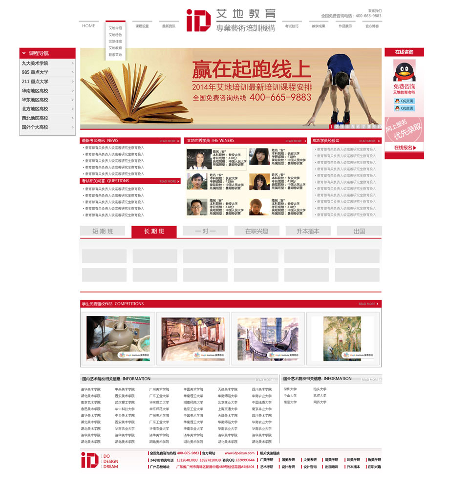 项目名称:艾地培训机构网站制作签定时间:2013-8-2项目网址:www.idpeixun.com机构简介:艾地培训是国内首家专注艺术-设计考研及出国的培训机构,艾地培训中心是依托广州艾地广告有限公司(国内著名设计机构)的一家实践与教学为一